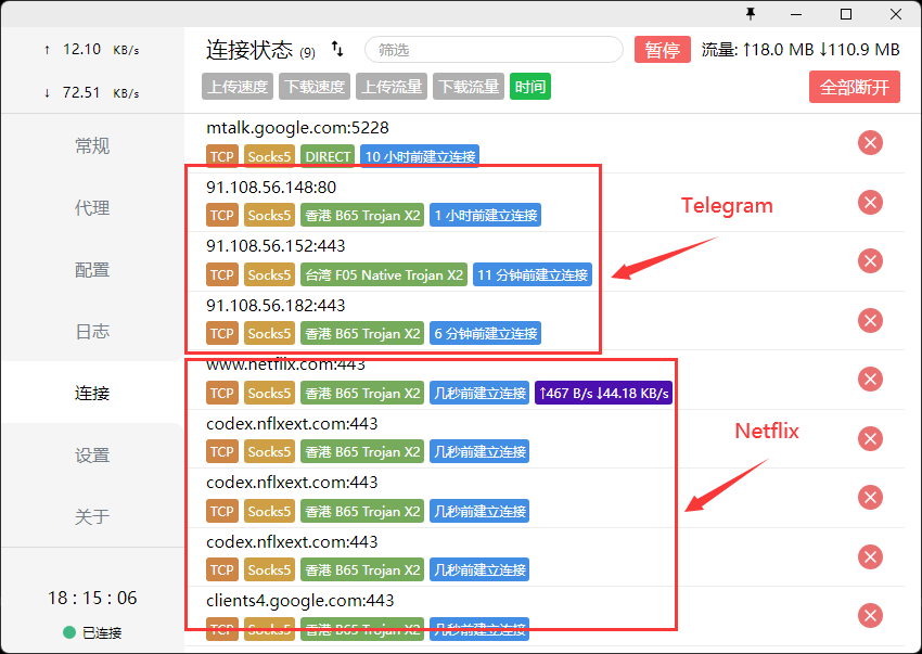 Clash for Windows 最大也是最强的优势在于节点可按规则进行分流使用,以往传统的客户端需要根据使用场景切换节点,例如看奈飞Netflix时需要使用支持播放的节点,浏览网站时需要使用延迟最低的节点。虽然以往的客户端也能做到按照PAC进行判断是否需要代理连接访问,但无法做到按节点分流。按规则分流的好处在于,可以同时使用多个节点,例如开着Telegram时,使Telegram连接A节点,同时打开Netflix观看影片时连接B节点。