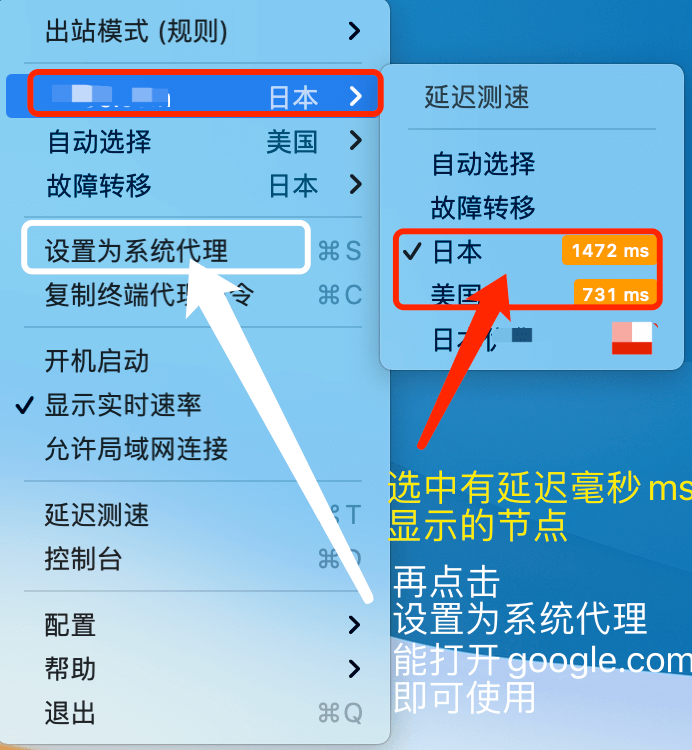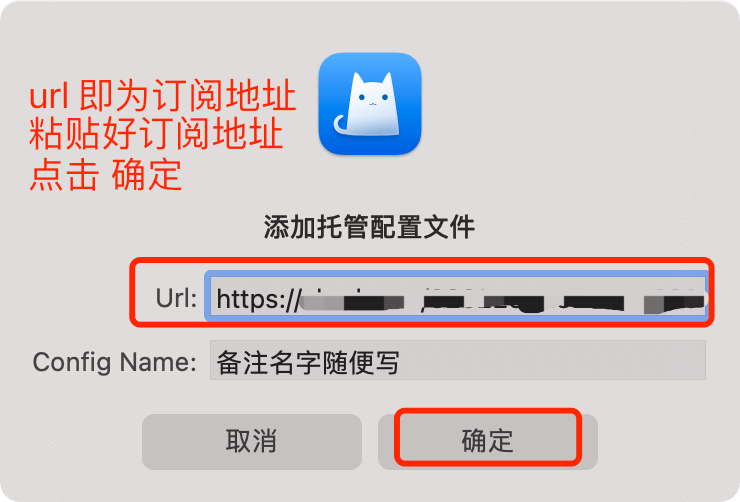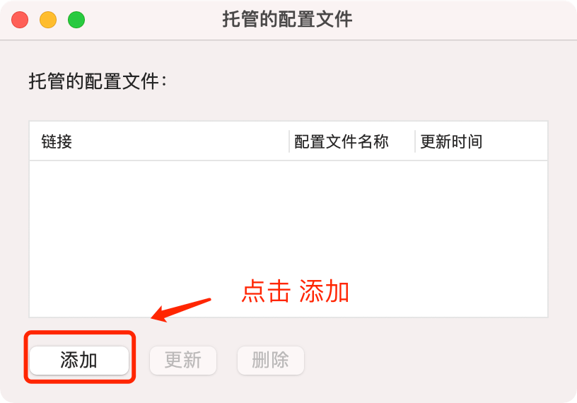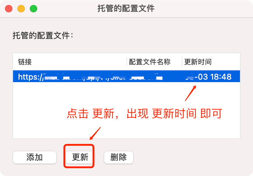 MacOS 下通过 ClashX 连接 1.下载并安装客户端 点此下载 2.打开软件,找到 配置-托管配置-管理。或者通过 用户中心 的 订阅中心 直接点击 配置一键导入 ,若使用一键导入可直接跳到第6步 3.在 托管的配置 页面,点击 添加 4.在Url一栏粘贴你的订阅地址,点击 确定 5.在 托管的配置 页面,点击 更新 6.选中你喜欢的地区节点,再点击 设置为系统代理,即可使用